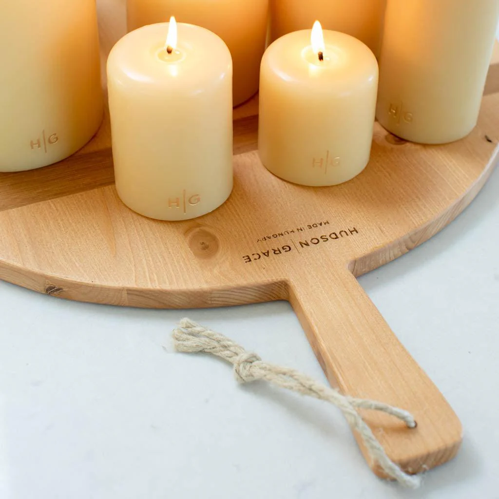 Exclusively Hudson Grace, our hand-dipped 3"x3" Amber pillar candle is made from all-natural paraffin and its rich amber color comes from natural tree resin. The pillar is unscented, making it ideal for dining, and hand embossed with a gold HG logo. The oversized cotton wick provides a generous flame.