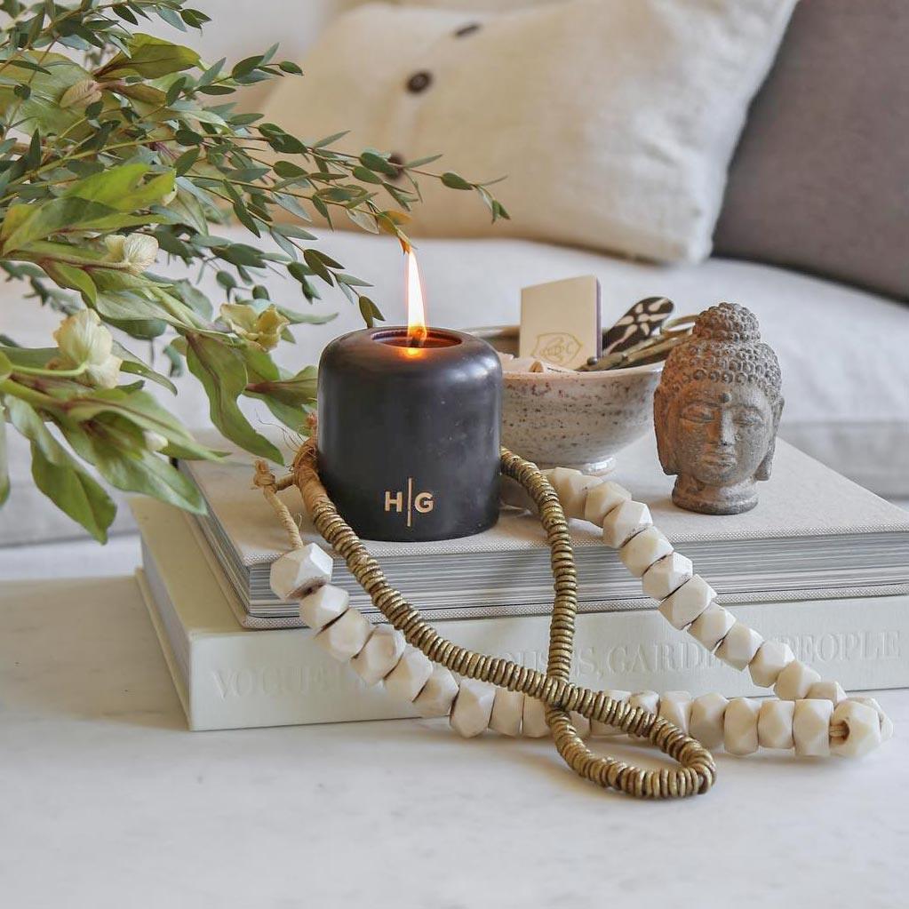 Exclusively Hudson Grace, our hand-dipped 3"x3" Black pillar candle is made from all-natural paraffin and amber tree resin. The candle has a black exterior over an amber interior. The pillar is unscented, making it ideal for dining, and hand embossed with a gold HG logo. The oversized cotton wick provides a generous flame. Always trim the wick before burning the candle.